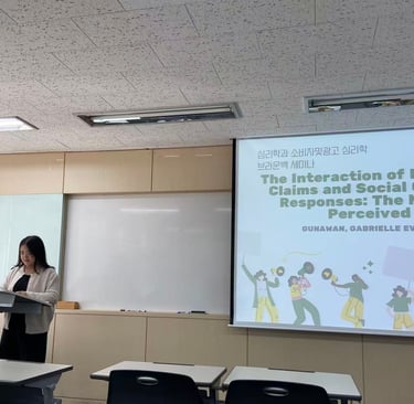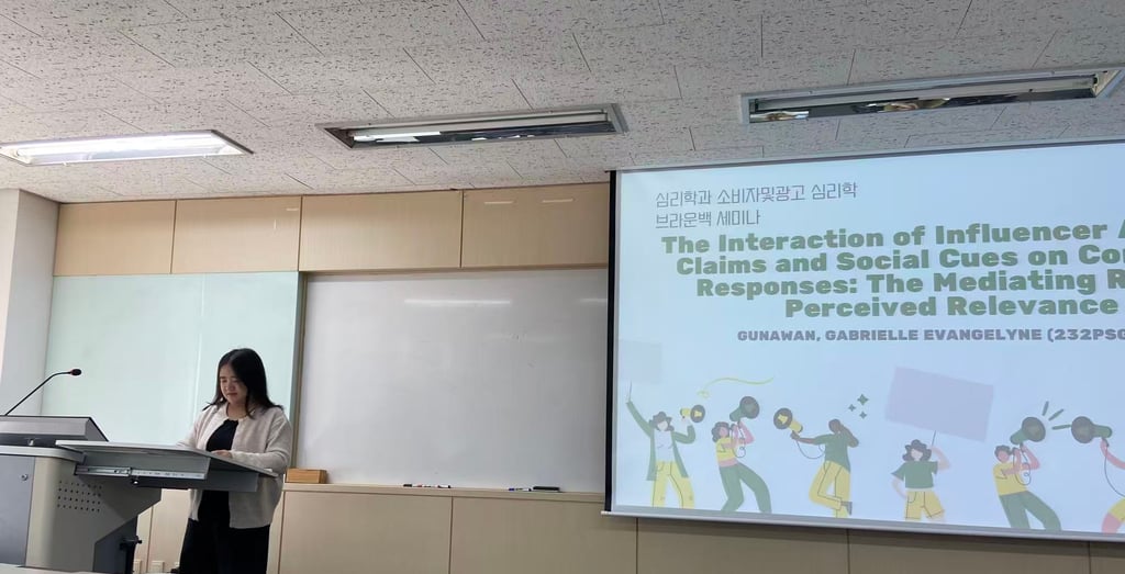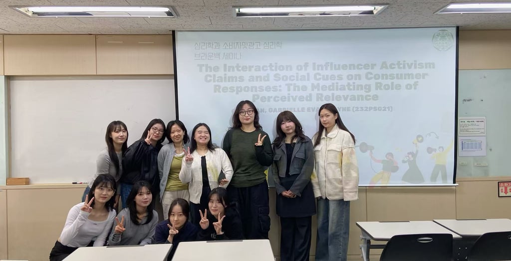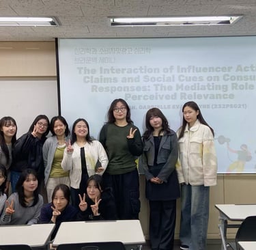Gabrielle Evangelyne 연구원이 인플루언서의 액티비즘 메시지와 사회적 단서가 소비자 반응에 미치는 영향을 주제로 석사 논문을 발표하였습니다. 연구실 모든 구성원이 함께 모여 Gabrielle Evangelyne 연구원의 졸업을 축하했습니다.