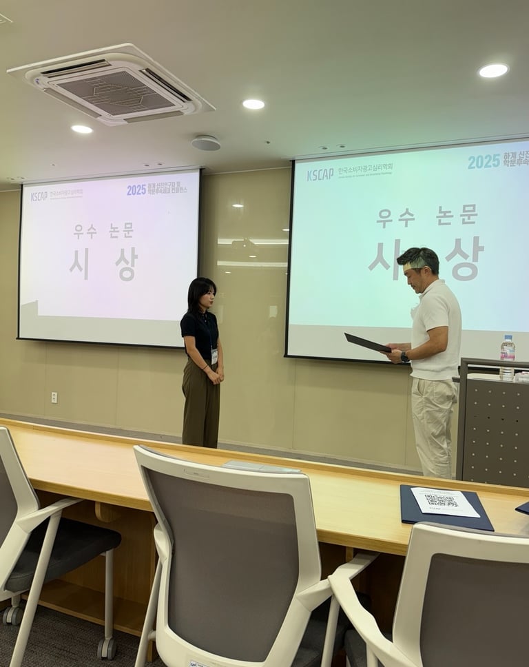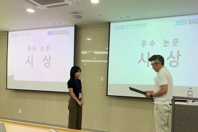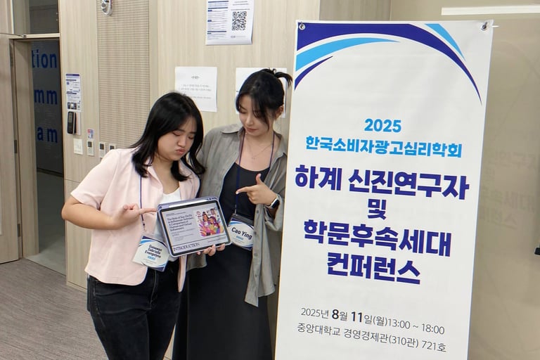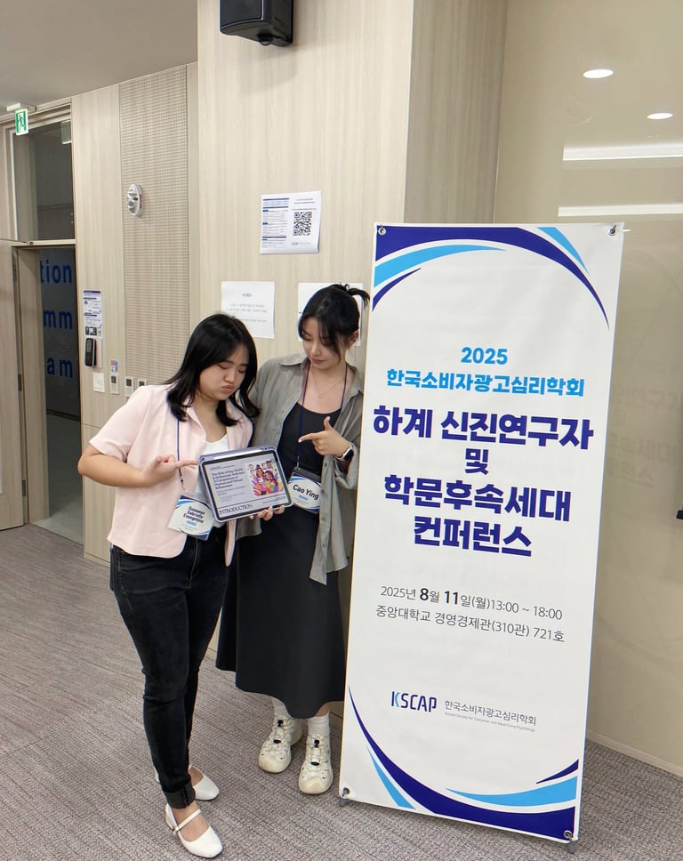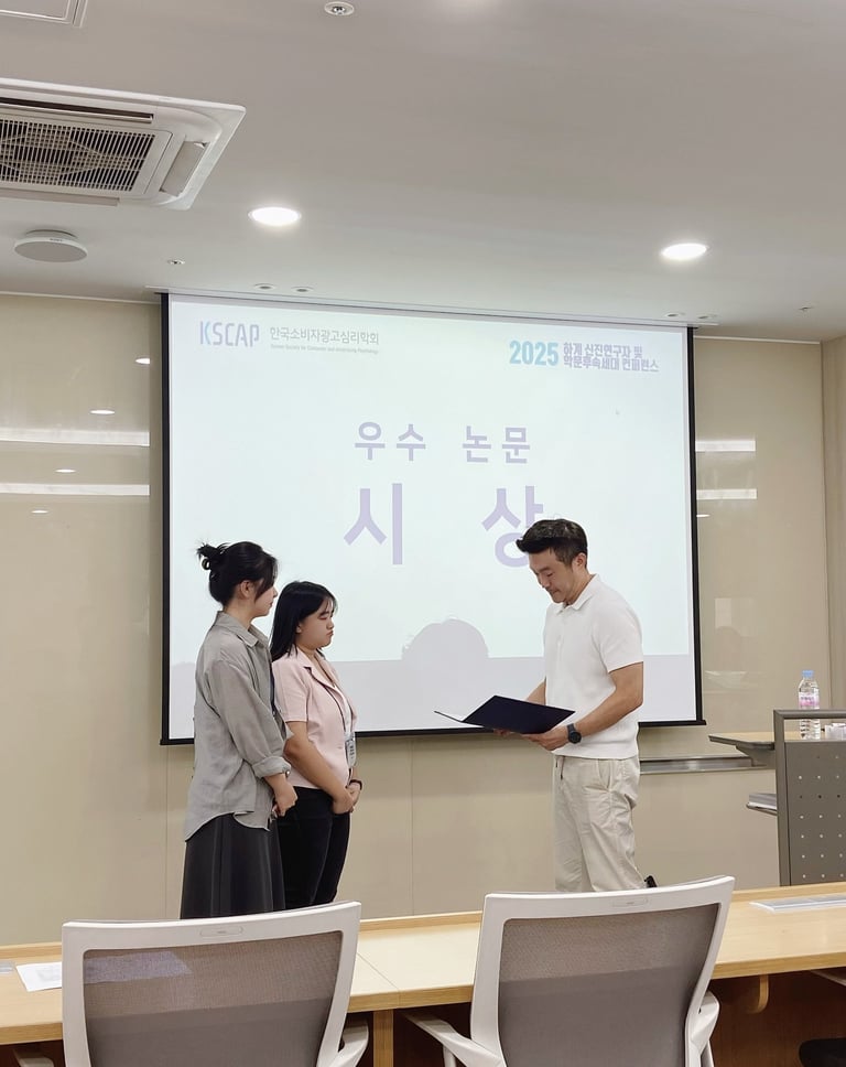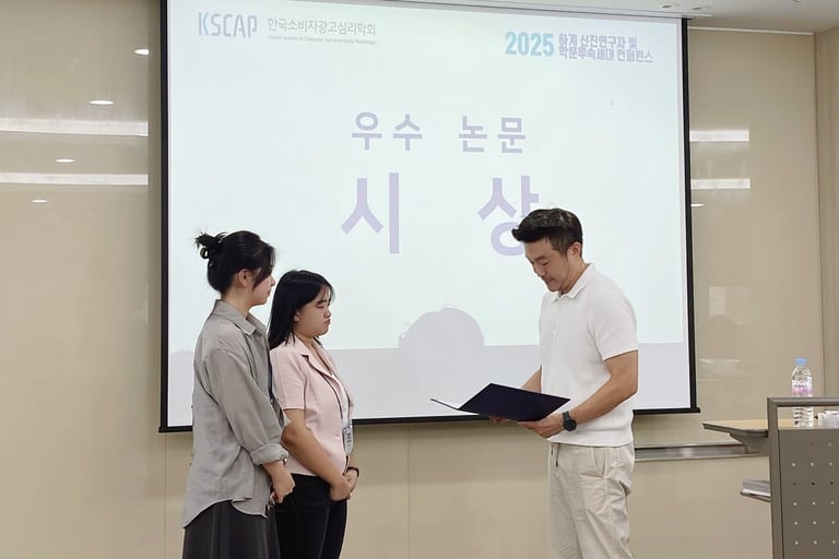 Gabrielle Gunawan, Cao Ying, 김세영 연구원, 조이서 박사님이 발표한 두 논문 모두 2025년 한국소비자광고심리학회 하계 신진연구자 및 학문후속세대 컨퍼런스에서 우수 논문상을 수상하였습니다